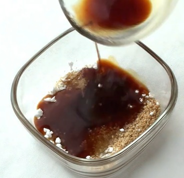 みたらし団子のたれを作ります。耐熱容器にてんさい糖、しょうゆ、みりん、片栗粉、水を入れて混ぜ、600Wの電子レンジで1分加熱します。一度取り出してかき混ぜ、さらに1分加熱します。