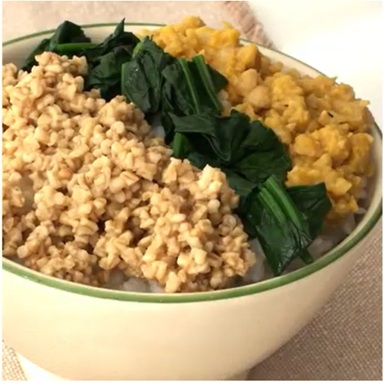 - 丼にご飯を盛り、スティールカットオーツの鶏そぼろ、ロールドオーツの卵そぼろ、ほうれん草をのせます。