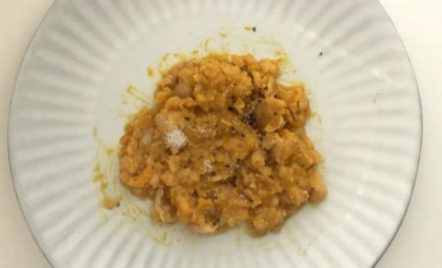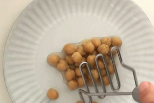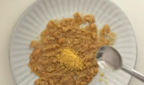 - ひよこ豆をフォークなどでつぶしてクリーム状にします。かぼちゃパウダー、塩こしょう、すりごまを加え、よく混ぜ合わせます。