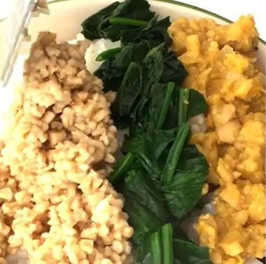 下の写真は、鶏そぼろだけスティールカットオーツを使い、鶏卵の卵そぼろの三色そぼろ丼です。