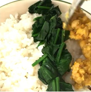 - ステップ4盛りつける丼にご飯を盛り、スティールカットオーツの鶏そぼろ、ロールドオーツの卵そぼろ、ほうれん草をのせます。