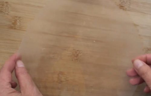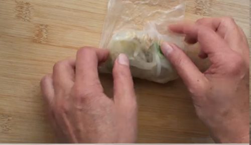 - ステップ3包むライスペーパー1枚を水に浸し、もどします。まな板の上に広げ、もやし、白菜、オートミール、ねぎをのせ、包みます。