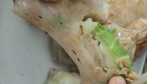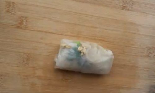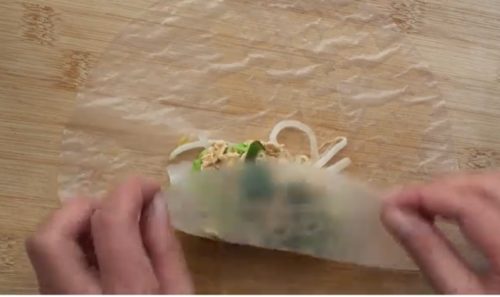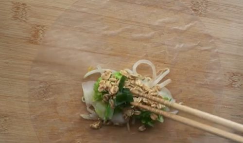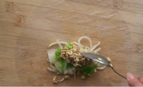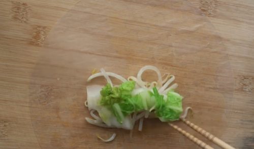 - ライスペーパー1枚を水に浸し、もどします。まな板の上に広げ、もやし、白菜、オートミール、ねぎをのせ、包みます。