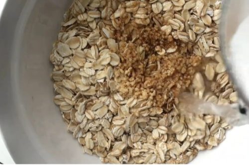 - ステップ1オートミールを準備をするボウルにオートミールを入れ、スープの素、お湯、しょう油、ごま油、酒を加えて混ぜ合わせ、しばらくおきます。