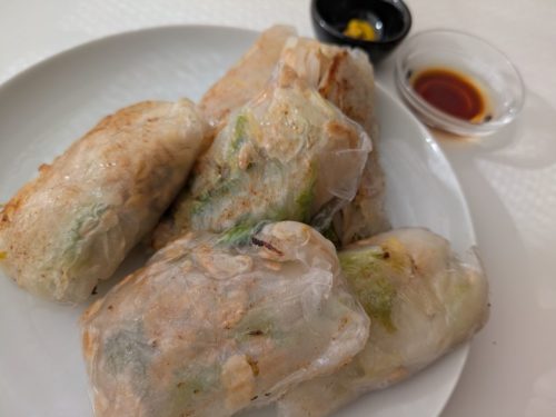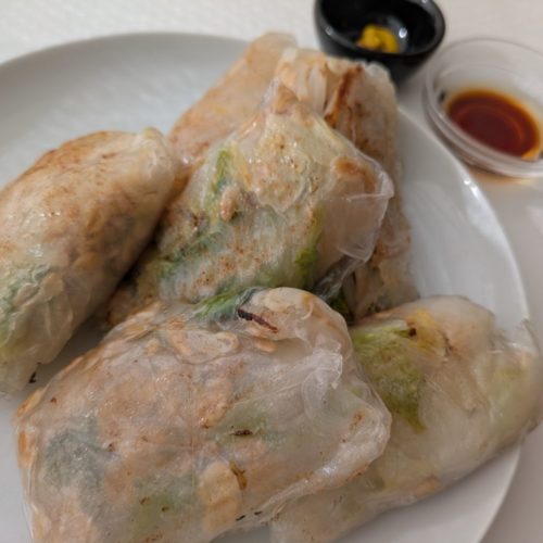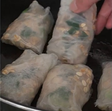 - 油をしいたフライパンに春巻きを入れ、両面がこんがりと色付くまで焼きます。