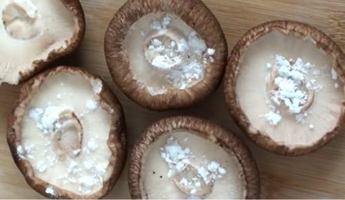• しいたけのかさの部分に片栗粉をまぶし、オートミールの具を詰めます。