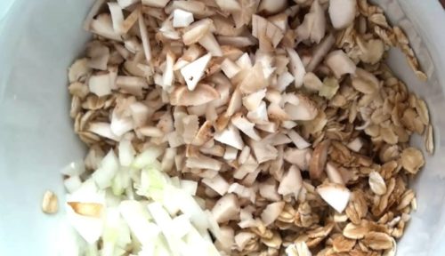 • ボウルにロールドオーツを入れ、熱湯を加えてふかします。片栗粉、酒、みりん、しょうゆ、塩こしょう、おろししょうが、玉ねぎ、しいたけの軸を加え、よく混ぜ合わせます。