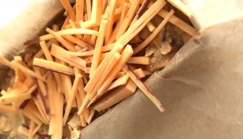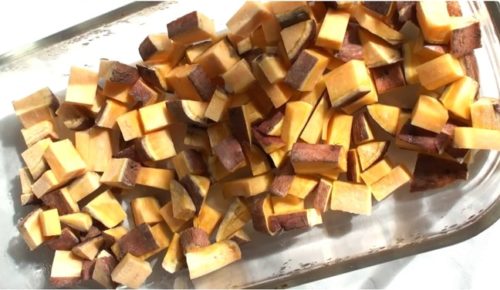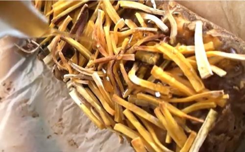 千切りしたさつまいもをトッピングし、ココナッツおいるをかけて、180℃に予熱したオーブンで20~25分焼きます。