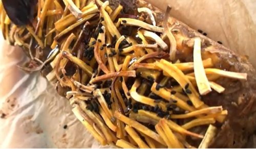 - 粗熱がとれたら、はちみつをかけ、黒ごまをちらします。