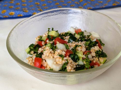 北アフリカ料理クスクスで用いられる、スムールというつぶつぶパスタに、キュウリやトマト、コリアンダー(パクチー)などを加えて、レモン汁とオリーブオイルをかけたサラダ。