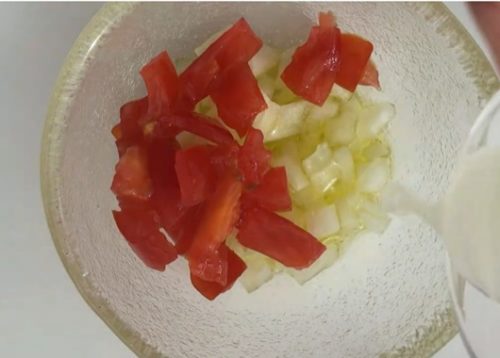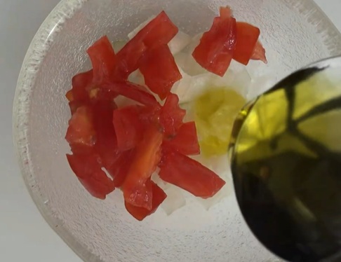 - ステップ2サルサソースを作るトマトは1㎝ぐらいの角切り、玉ねぎはみじん切りにして、これらにオリーブオイルとレモン汁を混ぜ合わせます。しばらく置いておきます。
