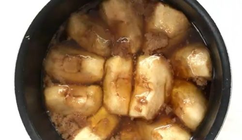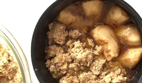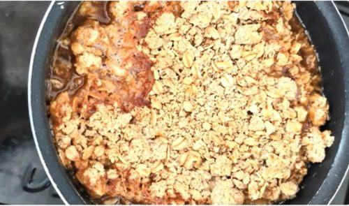 バターとブラウンシュガーで煮込んだりんごに、オートミール生地をのせ、焼き上がったらひっくり返します。そうすると、りんごをトッピングした、贅沢なデザートに。