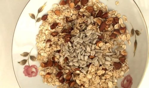 - ボウルにロールドオーツ、ココナッツオイル、粗く刻んだアーモンド、ひまわりの種、かぼちゃの種を入れて混ぜます。さらに、酒粕と塩を加えて、混ぜ合わせます。