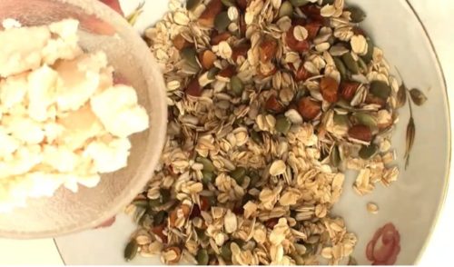 - ステップ2クランブルを作るボウルにロールドオーツ、ココナッツオイル、粗く刻んだアーモンド、ひまわりの種、かぼちゃの種を入れて混ぜます。さらに、酒粕と塩を加えて、混ぜ合わせます。