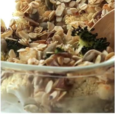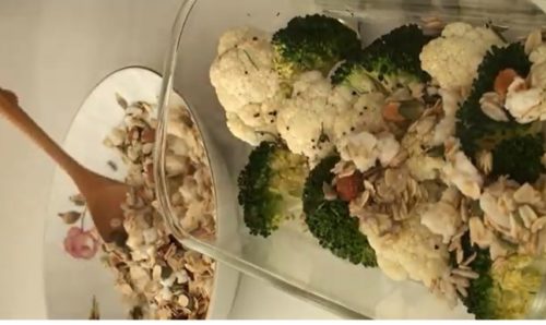 - 加熱したブロッコリーとカリフラワーのうえに、オートミールのクランブルをのせます。180℃で予熱したオーブンで20分ほど焼きます。