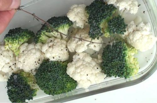 - ブロッコリーとカリフラワーを小房に分け、耐熱容器に入れ、水を大さじ2ほど加えます。塩こしょうして、タイムとローズマリーを加え、200℃に予約したオーブンで10分焼きます。