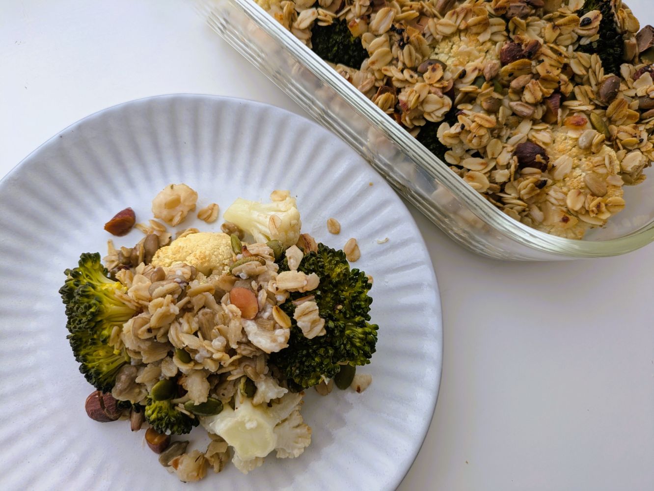 - 加熱したブロッコリーとカリフラワーのうえに、オートミールのクランブルをのせます。180℃で予熱したオーブンで20分ほど焼きます。