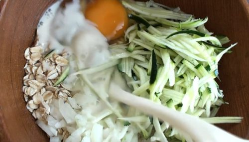 - ロールドオーツ、オーツ粉、はちみつ、重曹、塩こしょう、玉ねぎ、ズッキーニ、卵、豆乳を加え、混ぜ合わせます。