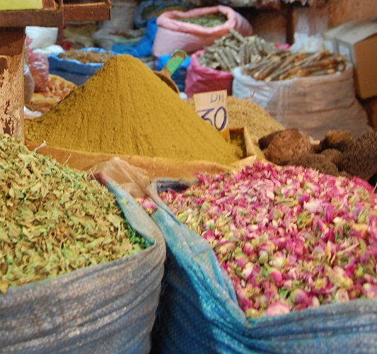 モロッコの市場では、スパイスなどの食品と美容グッズが同じ店に並んでいます。アラブ諸国では、香辛料も伝統的な生薬も同じ植物であることから、一緒に扱うようになったそうです。植物や鉱物由来のコスメが、スパイス屋においてあっても、不自然ではないのです。