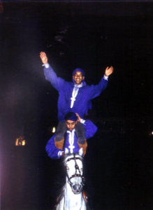 キラキラの金と銀の立派な馬具をつけた馬の上で、アクロバットを披露する男性も。
