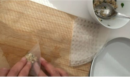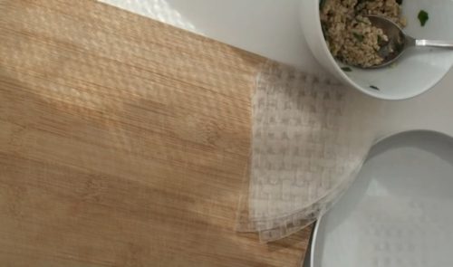 1枚を水に浸し、もどします。オートミールを中央におき、包みます。