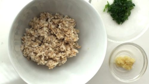 - ボウルにオートミールを入れ、小口切りした小ねぎ、すりおろしたしょうが、塩こしょう、酒、しょうゆを加え、よく混ぜ合わせます。